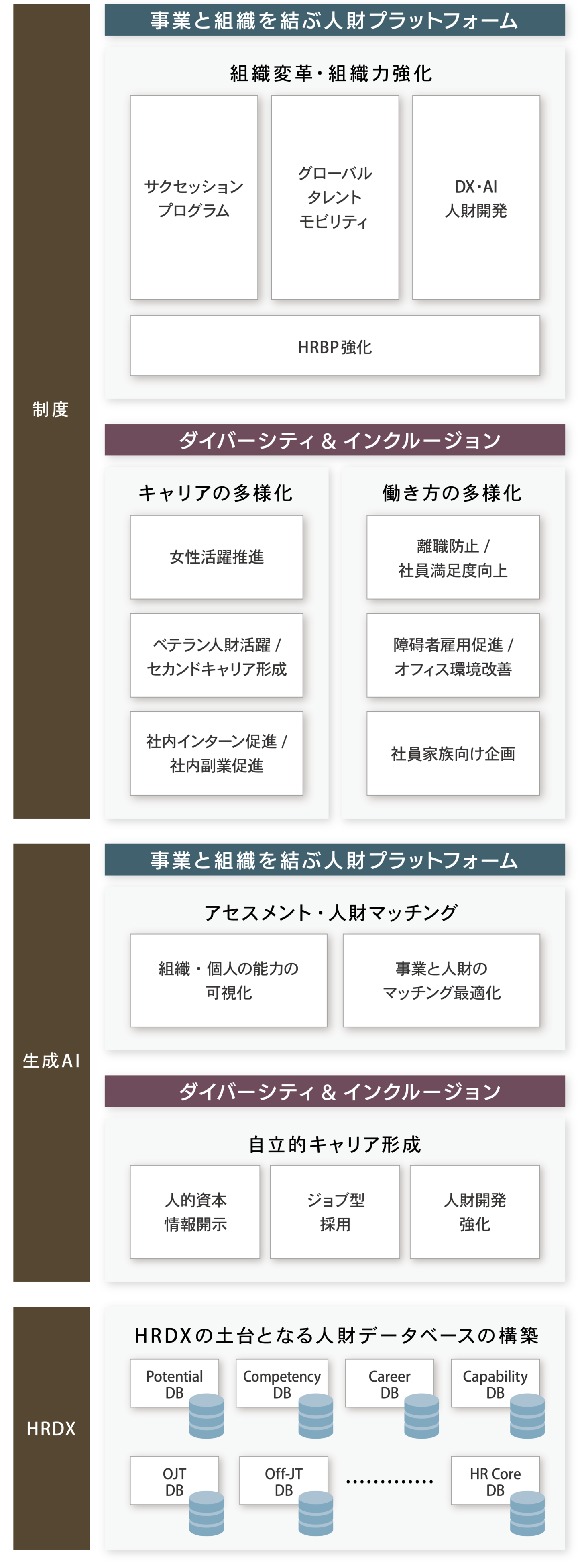 組織戦略コンサルティングの支援領域 組織戦略支援領域のコンサルティングでは、昨今の人的資本経営の高まりを背景に、弊社ナレッジ・ノウハウを生かした人財育成や組織変革、HR領域のデジタル化など各社のニーズに合わせた幅広いテーマで支援をしております