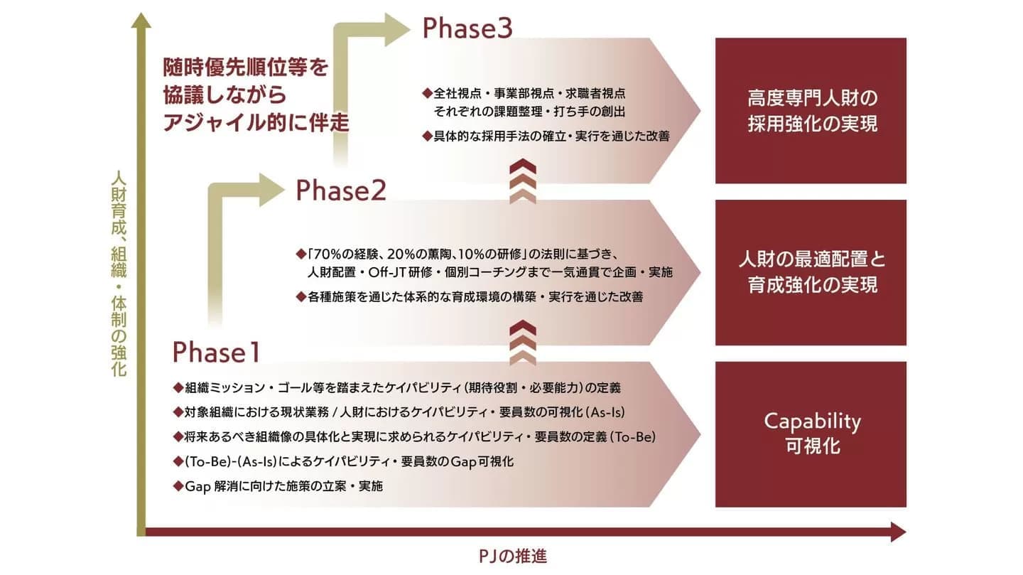 職位別期待役割・必要能力の定義、ケイパビリティの可視化、将来の組織像の設計、現状とのGap分析、分析結果に基づく採用・配置・育成領域のアップデートを伴走支援しました