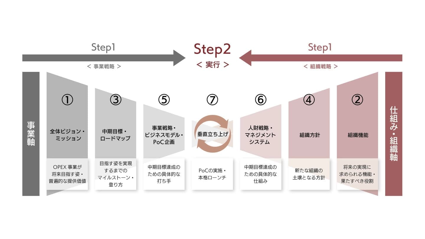 •事業軸と仕組み・組織軸の両軸を支援する前提のもと、具体的に以下大きく7つのテーマの策定&実行を推進