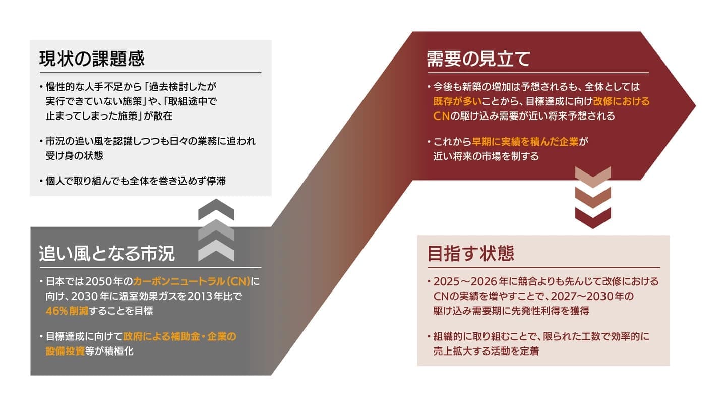 営業部門における非住宅部門の営業戦略・戦術実行支援とともに、営業管理のDX化、営業体制変革の中長期推進、戦略・戦術の型化、人財育成を支援